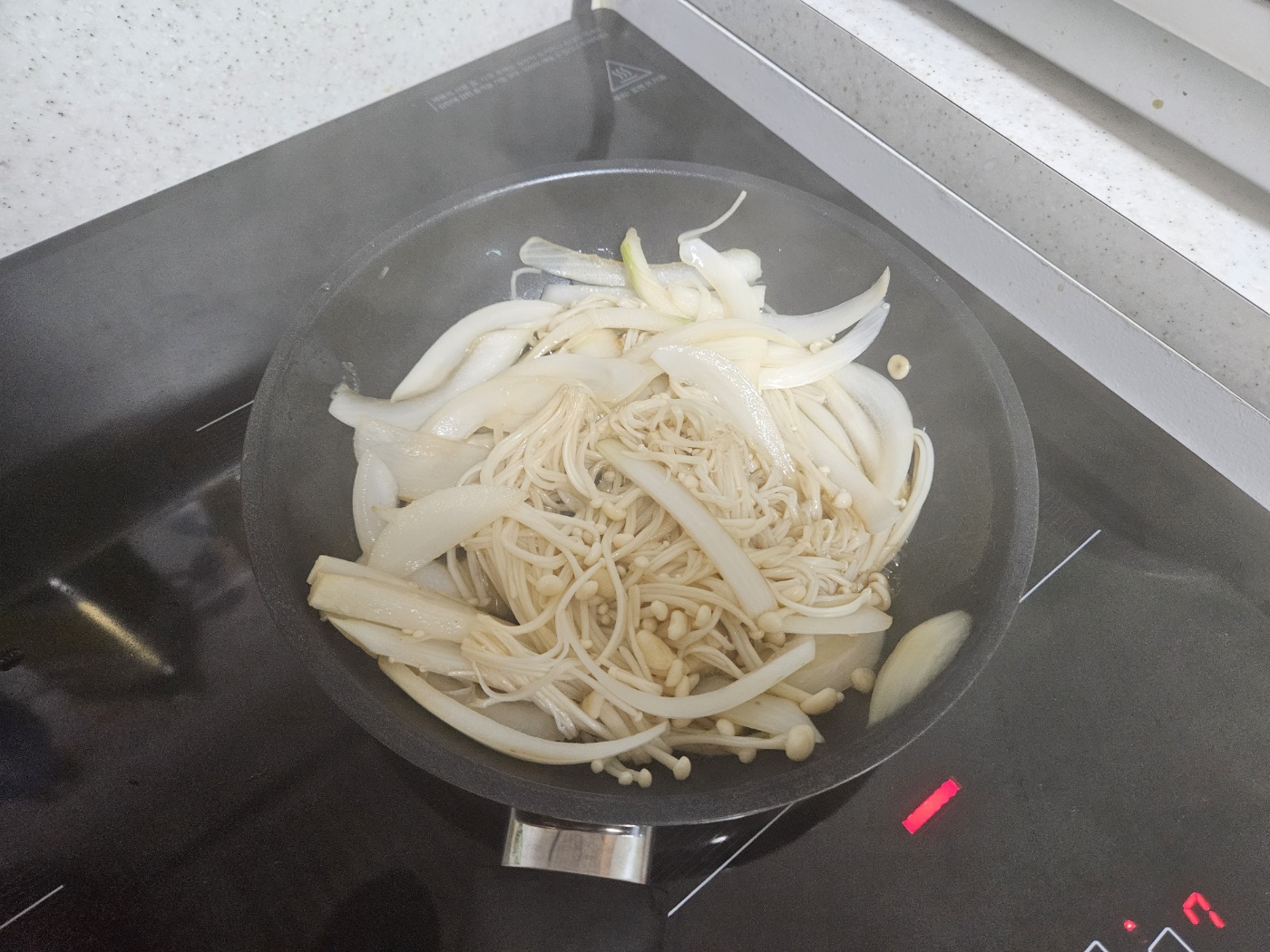 팽이버섯이 흐물 해지고, 양파가 살짝 반투명해졌을 때